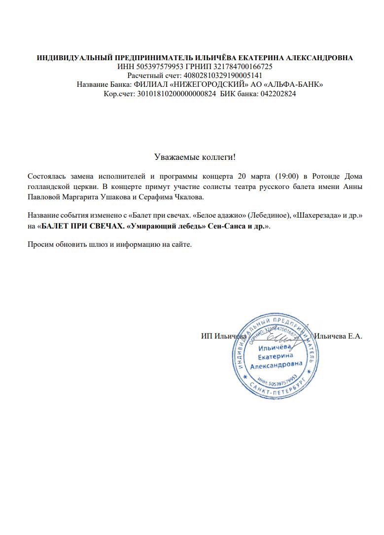 Уважаемый клиент! Спешим сообщить, что по информации, полученной от организатора, балет при свечах. «Белое адажио» (Лебединое), «Шахерезада» и др., запланированный на 20 марта 2026 года в 19:00 в Ротонде Домаголландской церкви, заменен на «БАЛЕТ ПРИ СВЕЧАХ. «Умирающий лебедь» Сен-Санса и др.». В концерте примут участие солисты театра русского балета имени АнныПавловой Маргарита Ушакова и Серафима Чкалова. Ранее приобретенные билеты действительны на новое шоу, обменивать их не нужно. Если вам не удобно посетить новое мероприятие, вы можете вернуть билет по кнопке в личном кабинете во вкладке «Заказы». Деньги за электронные билеты вернутся автоматически в полном объёме на карту, с которой была произведена оплата. Если вы купили билет в кассе Ticketland.ru за наличный расчет, то обратитесь, пожалуйста, на почту: vozvrat@ticketland.ru. С уважением, команда поддержки Ticketland.