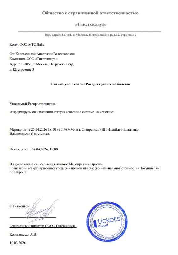 Уважаемый клиент! Спешим сообщить, что по информации, полученной от организатора, концерт «9 Грамм», запланированный на 25 апреля 2026 года в 18:00 в Концерт Холле, перенесен на 24 апреля 2026 года в 18:00. Ранее приобретенные билеты действительны на новую дату, обменивать их не нужно. Если вам не удобно посетить мероприятие в новую дату, вы можете вернуть билет по кнопке в личном кабинете во вкладке «Заказы». Деньги за электронные билеты вернутся автоматически в полном объёме на карту, с которой была произведена оплата. Если вы купили билет в кассе Ticketland.ru за наличный расчет, то обратитесь, пожалуйста, на почту: vozvrat@ticketland.ru. С уважением, команда поддержки Ticketland