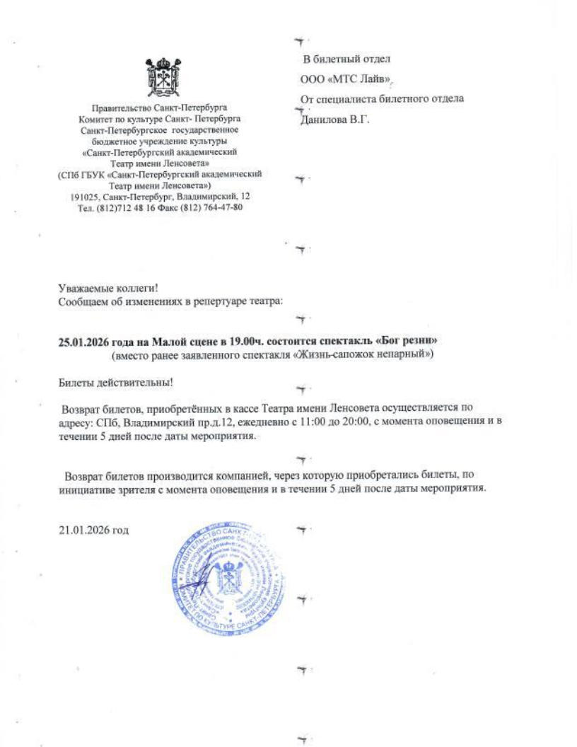 Уважаемый клиент! Спешим сообщить, что по информации, полученной от организатора, спектакль «Жизнь – сапожок непарный», запланированный на 25 января 2026 года в 19:00 в Театре им. Ленсовета, заменён на спектакль «Бог резни». Ранее приобретенные билеты действительны, обменивать их не нужно. Если вам не удобно посетить мероприятие, вы можете вернуть билет по кнопке в личном кабинете во вкладке «Заказы». Деньги за электронные билеты вернутся автоматически в полном объёме на карту, с которой была произведена оплата. Если вы купили билет в кассе Ticketland.ru за наличный расчет, то обратитесь, пожалуйста, на почту: vozvrat@ticketland.ru. Возврат билетов, приобретённых в кассе Театра имени Ленсовета осуществляется по адресу: СПб, Владимирский пр.д. 12, ежедневно с 11:00 до 20:00, с момента оповещения и в течении 5 дней после даты мероприятия. Письмо от организатораС уважением, команда поддержки Ticketland.