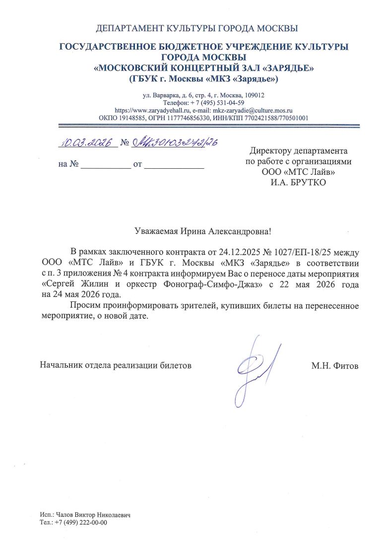 Уважаемый клиент! Спешим сообщить, что по информации, полученной от организатора, концерт Сергея Жилина и оркестра «Фонограф-Симфо-Джаз», запланированный на 22 мая 2026 года в 19:00 в МКЗ «Зарядье», перенесен на 24 мая 2026 года в 19:00. Ранее приобретенные билеты действительны на новую дату, обменивать их не нужно. С уважением, команда поддержки Ticketland