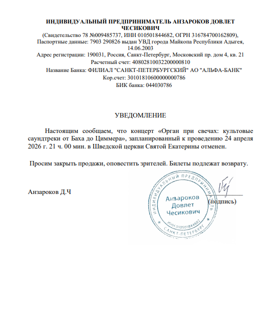 Уважаемый клиент! Спешим сообщить, что по информации, полученной от организатора, концерт «Орган при свечах: культовые саундтреки от Баха до Циммера», запланированный на 24 апреля 2026 года в 21:00 в Шведской церкви Св. Екатерины, отменен. Деньги за электронные билеты вернутся автоматически в полном объёме на карту, с которой была произведена оплата. Если вы купили билет в кассе Ticketland.ru за наличный расчет или оплатили подарочной картой, то обратитесь, пожалуйста, на почту: vozvrat@ticketland.ru. С уважением, команда поддержки Ticketland.