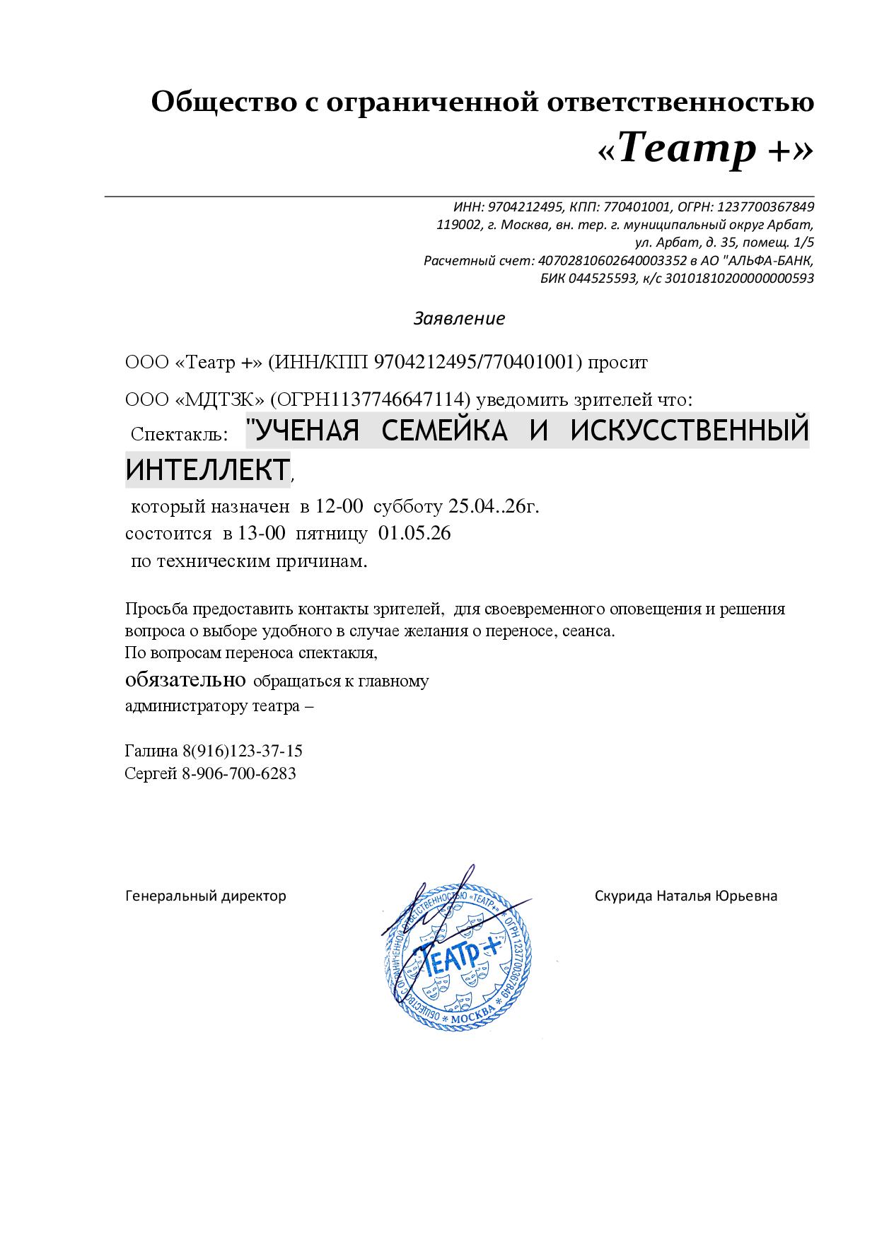 Уважаемый клиент! Спешим сообщить, что по информации, полученной от организатора, спектакль «Ученая семейка и Искусственный интеллект!», запланированный на 25 апреля 2026 года в 12:00 в театре Мира, перенесён на 1 мая 2026 года, начало в 13:00. По всем вопросам обращайтесь, пожалуйста, к организатору по следующим контактным данным: Галина +7 (916) 123-37-15, Сергей +7 (906) 700-62-83. С уважением, команда поддержки Ticketland.
