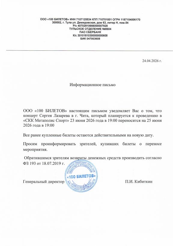Уважаемый клиент! Спешим сообщить, что по информации, полученной от организатора, концерт Сергея Лазарева «Шоумен», запланированный на 23 июня 2026 года в 19:00 в СКК «Мегаполис Спорт», перенесён на 25 июня 2026 года, начало в 19:00. Ранее приобретенные билеты действительны, обменивать их не нужно. Если вам не удобно посетить мероприятие в новое время, вы можете вернуть билет по кнопке в личном кабинете во вкладке «Заказы». Деньги за электронные билеты вернутся автоматически в полном объёме на карту, с которой была произведена оплата. Если вы купили билет в кассе Ticketland.ru за наличный расчет или оплатили подарочной картой , то обратитесь, пожалуйста, на почту: vozvrat@ticketland.ru. С уважением, команда поддержки Ticketland.