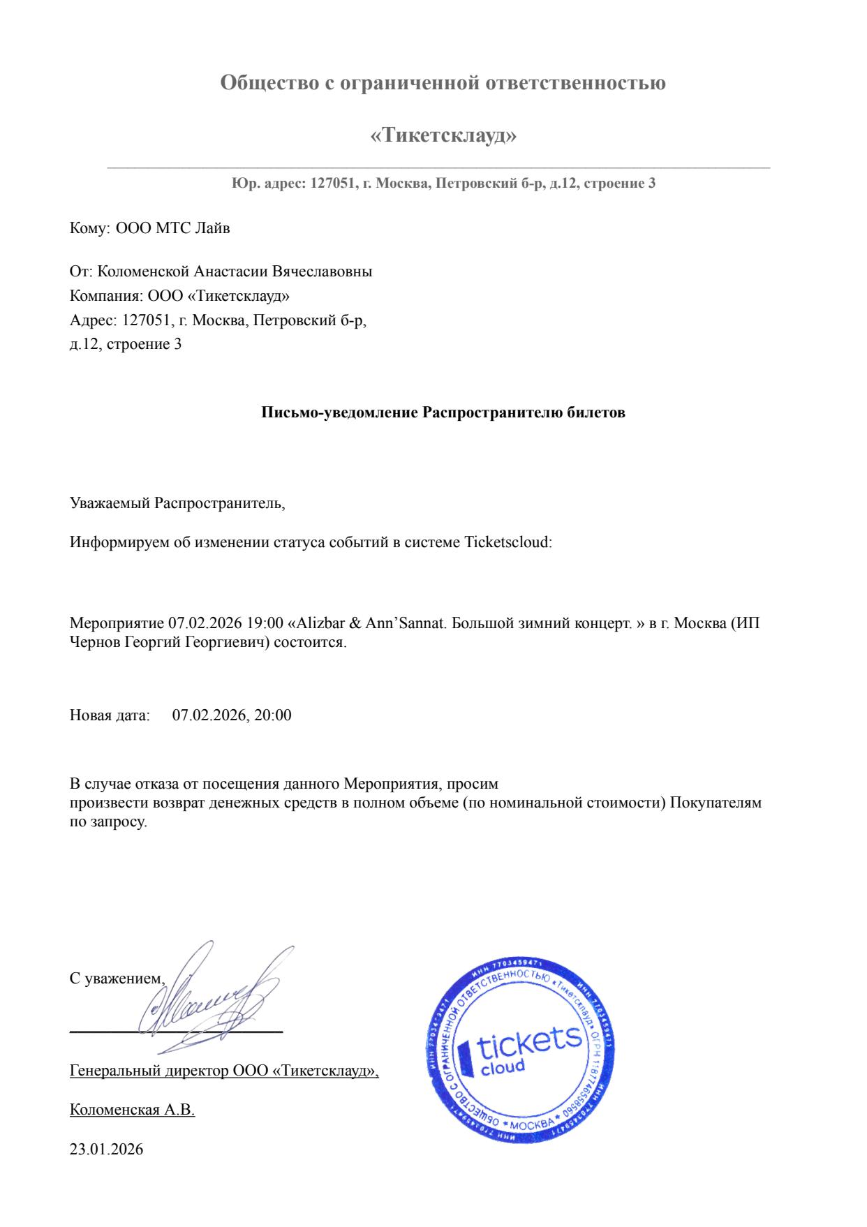 Уважаемый клиент! Спешим сообщить, что по информации, полученной от организатора, сольный концерт Ислама Итляшева с программой - ОНА ЛЮБИЛА РОЗЫ», запланированный на 20 февраля 2025 года в Липецк КРК Мегаполис, перенесен на открытую дату в связи с болезнью артиста.. Новая дата будет объявлена дополнительно. Ранее приобретенные билеты действительны на новую дату, обменивать их не нужно. Если вам не удобно посетить мероприятие в новую дату, вы можете вернуть билет по кнопке в личном кабинете во вкладке «Заказы». Деньги за электронные билеты вернутся автоматически в полном объёме на карту, с которой была произведена оплата. Если вы купили билет в кассе Ticketland.ru за наличный расчет, то обратитесь, пожалуйста, на почту: vozvrat@ticketland.ru. С уважением, команда поддержки Ticketland.