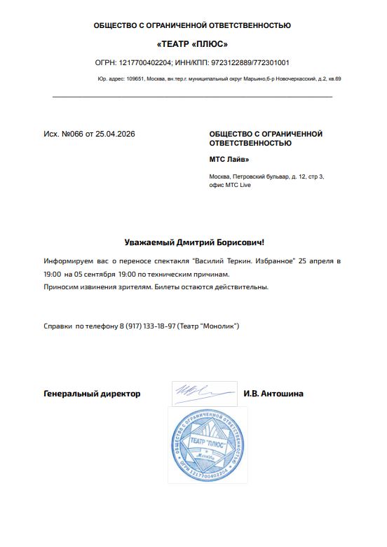 Уважаемый клиент! Спешим сообщить, что по информации, полученной от организатора, спектакль «Василий Теркин. Избранное», запланированный на 25 апреля 2026 года в 19:00 в ДК Гайдаровец, перенесён на 5 сентября 2026 года, начало в 19:00. Ранее приобретенные билеты действительны, обменивать их не нужно. Если вам не удобно посетить мероприятие в новую дату, вы можете вернуть билет по кнопке в личном кабинете во вкладке «Заказы». Деньги за электронные билеты вернутся автоматически в полном объёме на карту, с которой была произведена оплата. Если вы купили билет в кассе Ticketland.ru за наличный расчет или оплатили подарочной картой , то обратитесь, пожалуйста, на почту: vozvrat@ticketland.ru. По всем дополнительным вопросам обращайтесь, пожалуйста, к организатору спектакля по номеру телефона: 8 (917)133-18-97 (Театр «Монолик»). С уважением, команда поддержки Ticketland.