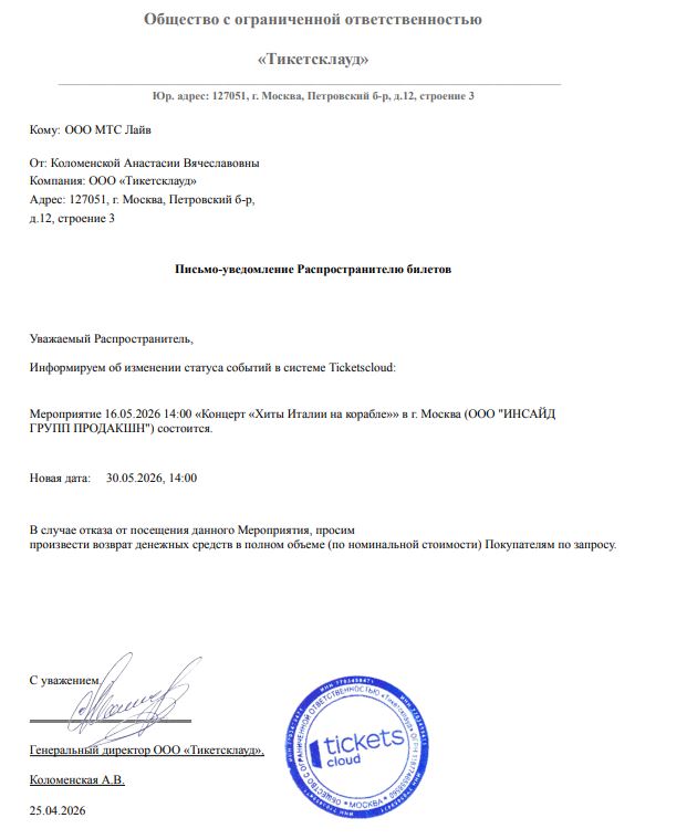 Уважаемый клиент! Спешим сообщить, что по информации, полученной от организатора, концерт «Хиты Италии на корабле», запланированный на 16 мая 2026 года в 14:00 на теплоходе «Рио-4», перенесен на 30 мая, начало в 14:00. Ранее приобретенные билеты действительны, обменивать их не нужно. Если вам не удобно посетить мероприятие в новую дату, вы можете вернуть билет по кнопке в личном кабинете во вкладке «Заказы». Деньги за электронные билеты вернутся автоматически в пол-ном объёме на карту, с которой была произведена оплата. Если вы купили билет в кассе Ticketland.ru за наличный расчет, то обратитесь, пожалуйста, на почту: vozvrat@ticketland.ru. С уважением, команда поддержки Ticketland.