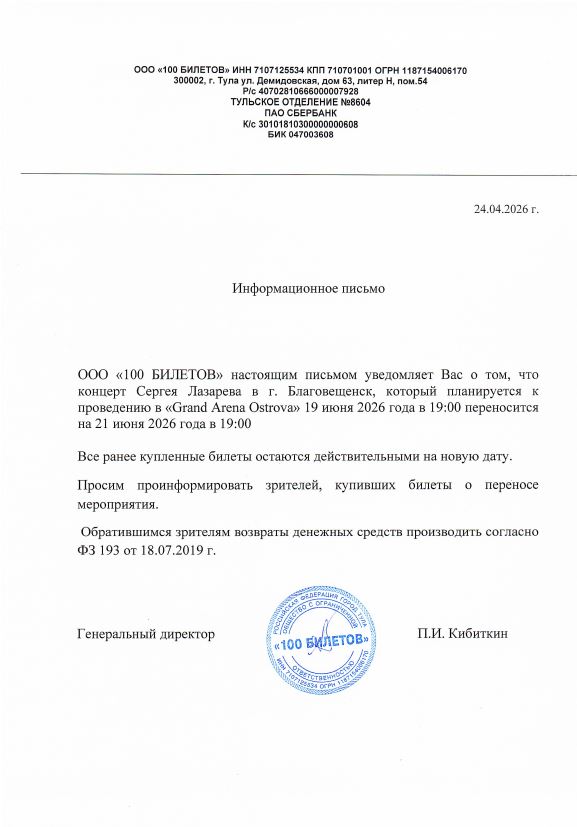 Уважаемый клиент! Спешим сообщить, что по информации, полученной от организатора, концерт Сергея Лазарева «Шоумен», запланированный на 19 июня 2026 года в 19:00 в Grand Arena Ostrova (г. Благовещенск), перенесён на 21 июня 2026 года, начало в 19:00. Ранее приобретенные билеты действительны, обменивать их не нужно. Если вам не удобно посетить мероприятие в новое время, вы можете вернуть билет по кнопке в личном кабинете во вкладке «Заказы». Деньги за электронные билеты вернутся автоматически в полном объёме на карту, с которой была произведена оплата. Если вы купили билет в кассе Ticketland.ru за наличный расчет или оплатили подарочной картой , то обратитесь, пожалуйста, на почту: vozvrat@ticketland.ru. С уважением, команда поддержки Ticketland.
