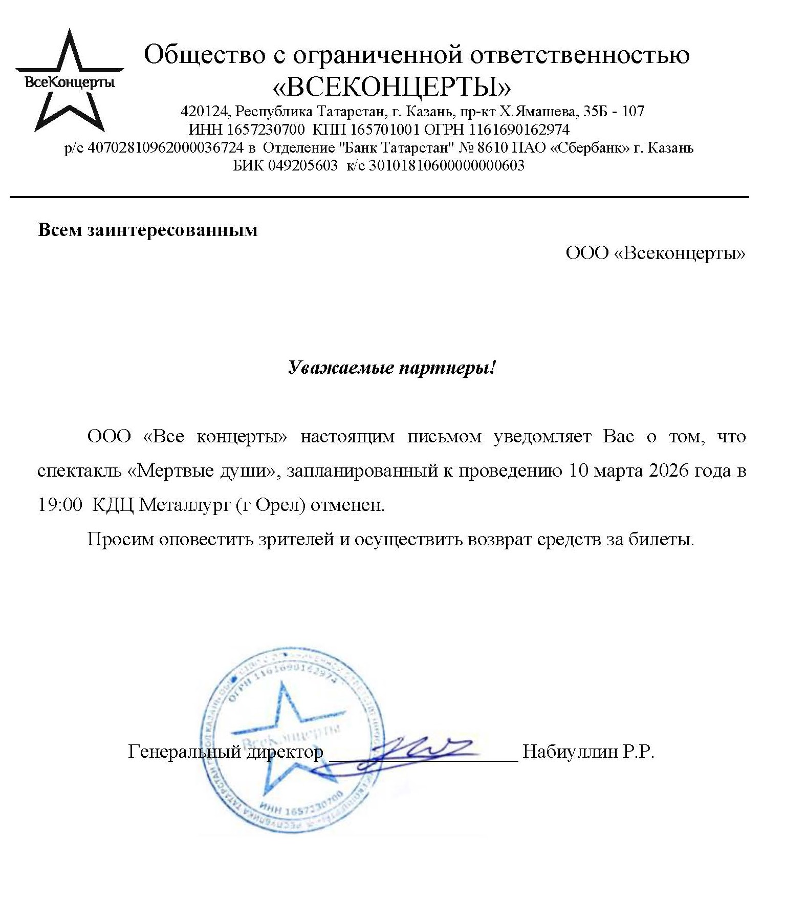 Уважаемый клиент! Спешим сообщить, что по информации, полученной от организатора, спектакль «Мертвые души», запланированный на 10 марта 2026 года в 19:00 в МАУК «КДЦ «Металлург», отменён. Деньги за электронные билеты вернутся автоматически в полном объёме на карту, с которой была произведена оплата. Если вы купили билет в кассе Ticketland.ru за наличный расчет, то обратитесь, пожалуйста, на почту: vozvrat@ticketland.ru. С уважением, команда поддержки Ticketland.