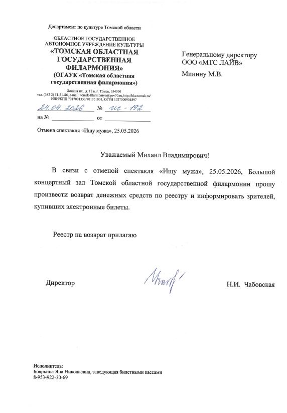 Уважаемый клиент! Спешим сообщить, что по информации, полученной от организатора, спектакль «Ищу мужа», запланированный на 25 мая 2026 года в 19:00 в Томской филармонии, отменен. Деньги за электронные билеты вернутся автоматически в полном объёме на карту, с которой была произведена оплата. Если вы купили билет в кассе Ticketland.ru за наличный расчет или оплатили подарочной картой, то обратитесь, пожалуйста, на почту: vozvrat@ticketland.ru. С уважением, команда поддержки Ticketland.