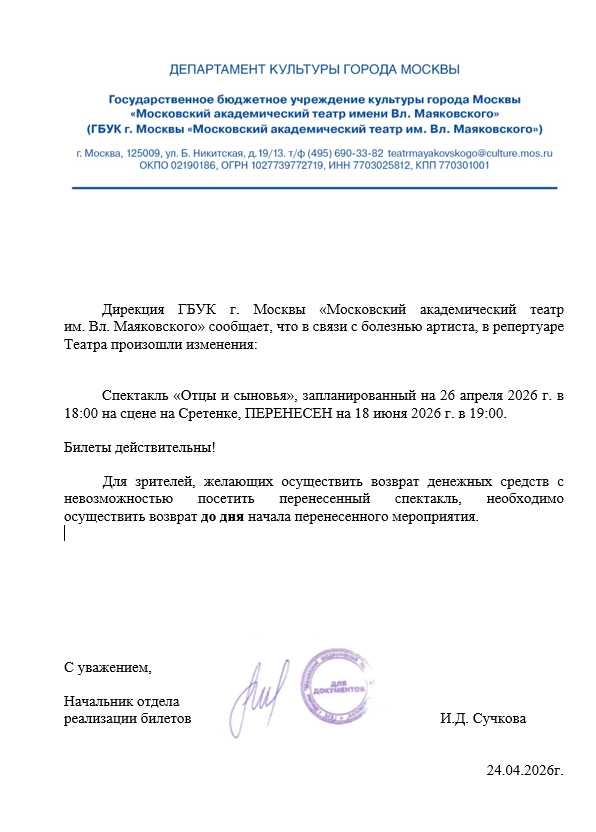Уважаемый клиент! Спешим сообщить, что по информации, полученной от организатора, спектакль «Отцы и сыновья», запланированный на 26 апреля 2026 года в 18:00 в театре Маяковского, перенесен на 18 июня 2026 года в 19:00. Ранее приобретенные билеты действительны. Если вам не удобно посетить мероприятие в новое время, вы можете вернуть билет по кнопке в личном кабинете во вкладке «Заказы». Деньги за электронные билеты вернутся автоматически в полном объёме на карту, с которой была произведена оплата. Если вы купили билет в кассе Ticketland.ru за наличный расчет или оплатили подарочной картой , то обратитесь, пожалуйста, на почту: vozvrat@ticketland.ru. С уважением, команда поддержки Ticketland.