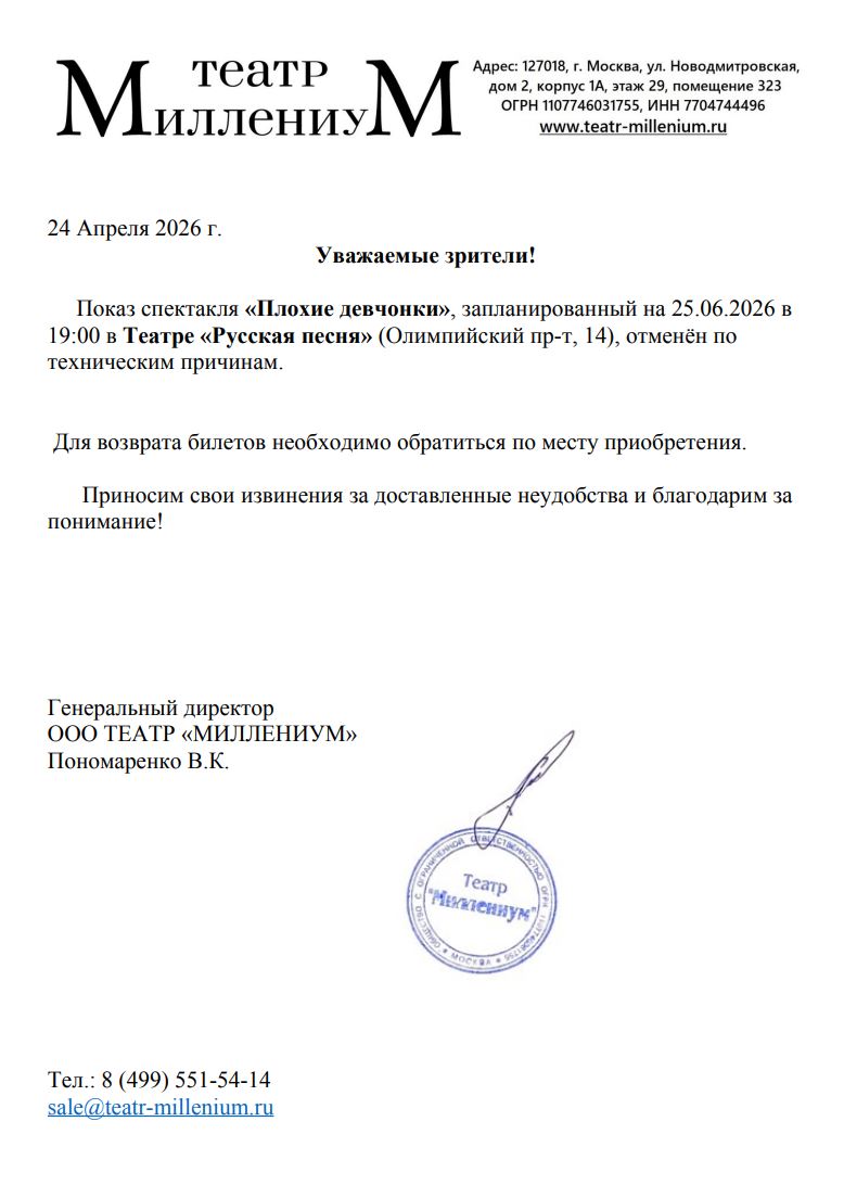 Уважаемый клиент! Спешим сообщить, что по информации, полученной от организатора, спектакль «Плохие девчонки», запланированный на 25 июня 2026 года в 19:00 в театре «Русская песня», отменен. Деньги за электронные билеты вернутся автоматически в полном объёме на карту, с которой была произведена оплата. Если вы купили билет в кассе Ticketland.ru за наличный расчет или оплатили подарочной картой, то обратитесь, пожалуйста, на почту: vozvrat@ticketland.ru. С уважением, команда поддержки Ticketland.