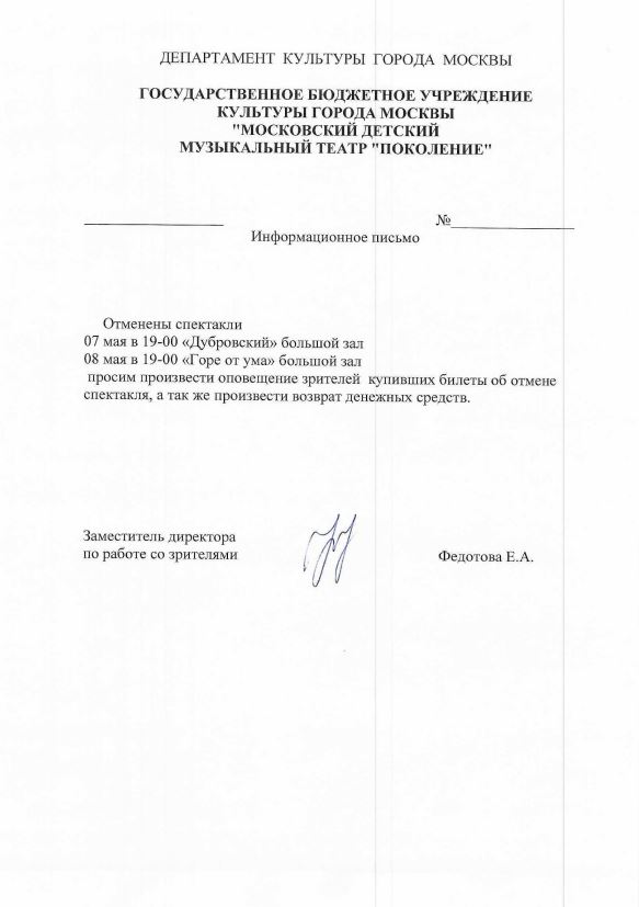 Уважаемый клиент! Спешим сообщить, что по информации, полученной от организатора, мюзикл «Дубровский», запланированный на 7 мая 2026 года в 19:00 в театре «Поколение», отменен. Деньги за электронные билеты вернутся автоматически в полном объёме на карту, с которой была произведена оплата. Если вы купили билет в кассе Ticketland.ru за наличный расчет или оплатили подарочной картой, то обратитесь, пожалуйста, на почту: vozvrat@ticketland.ru. С уважением, команда поддержки Ticketland.