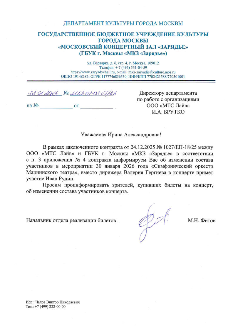 Уважаемый клиент! Спешим сообщить, что по информации, полученной от организатора, у концерта «Симфонический оркестр Мариинского театра», запланированного на 30 января 2026 года в 19:00 в МКЗ «Зарядье», произошли изменения: вместо дирижера Валерия Гергиева в концерте примет участие Иван Рудин. Ранее приобретенные билеты действительны, обменивать их не нужно. Если вам не удобно посетить мероприятие, вы можете вернуть билет по кнопке в личном кабинете во вкладке «Заказы». Деньги за электронные билеты вернутся автоматически в полном объёме на карту, с которой была произведена оплата. Если вы купили билет в кассе Ticketland.ru за наличный расчет, то обратитесь, пожалуйста, на почту: vozvrat@ticketland.ru. С уважением, команда поддержки Ticketland.