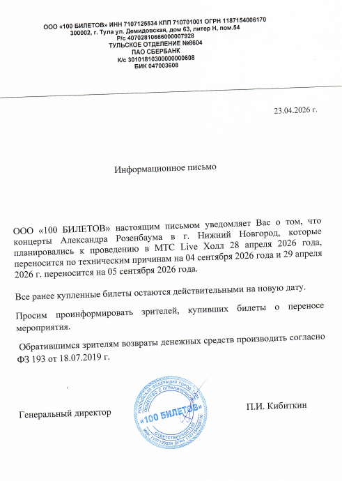 Уважаемый клиент! Спешим сообщить, что по информации, полученной от организатора, концерт Александра Розенбаума, запланированный на 20 сентября 2025 года в 19:00 в КТЦ «Югра-Классик», перенесён на открытую дату. О новой дате концерта будет объявлено дополнительно. Ранее приобретенные билеты действительны на новую дату, обменивать их не нужно. Если вам не удобно посетить концерт в новую дату, вы можете вернуть билет по кнопке в личном кабинете во вкладке «Заказы» (до 30 сентября 2025 года включительно). Деньги за электронные билеты вернутся автоматически в полном объёме на карту, с которой была произведена оплата. Если вы купили билет в кассе Ticketland.ru за наличный расчет, то обратитесь, пожалуйста, на почту: vozvrat@ticketland.ru. С уважением, команда поддержки Ticketland.