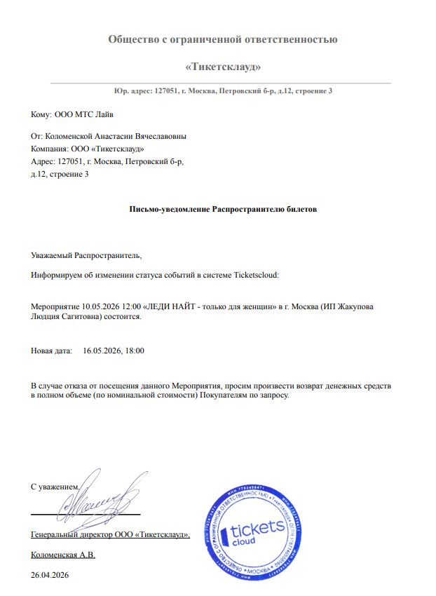 Уважаемый клиент! Спешим сообщить, что по информации, полученной от организатора, спектакль «Леди Найт – только для женщин», запланированный на 10 мая 2026 года в 12:00 в театре в Хамовниках, перенесён на 16 мая 2026 года, начало в 18:00. Ранее приобретённые билеты действительны, обменивать их не нужно. Если вам не удобно посетить мероприятие, вы можете вернуть билет по кнопке в личном кабинете во вкладке «Заказы». Деньги за электронные билеты вернутся автоматически в полном объёме на карту, с которой была произведена оплата. Если вы купили билет в кассе Ticketland.ru за наличный расчет или оплатили подарочной картой , то обратитесь, пожалуйста, на почту: vozvrat@ticketland.ru. С уважением, команда поддержки Ticketland