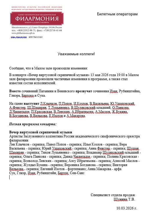 Уважаемый клиент! Спешим сообщить, что по информации, полученной от организатора, в концерте «Вечер виртуознойскрипичной музыки, аб-т №12» запланированном 13 мая 2026 года в 19:00 в Малом зале филармонии произошличастичные изменения в программе, а также стал известен состав исполнителей. Вместо сочинений Паганини и Венявского прозвучат сочинения Изаи, Рубинштейна, Глиэра, Бартока и Сука. На сцене выступят Л.Клычков, П.Попов, И.Козлов, В.Васильева, Ю.Ущаповский, А.Фенстер, Ш.Шамирян, Т.Лукьяненко, В.Шуляковский-младший, О.Панкова, Д.Чакветадзе, П.Красовская, В.Ленских, А.Ибрагимова, А.Маслов, Ж.Букина, В.Богданова, В.Велькова, Е.Изотов и А.Макарова. Полная программа концерта: Вечер виртуозной скрипичной музыки Артисты Заслуженного коллектива России академического симфонического оркестра филармонииЛев Клычков – скрипка; Павел Попов – скрипка; Илья Козлов – скрипка; Вера Васильева – скрипка; Юрий Ущаповский – скрипка; Анна Фенстер – скрипка; Шушан Шамирян – скрипка; Тихон Лукьяненко – скрипка; Владимир Шуляковский-младший – скрипка; Ольга Панкова – скрипка; Давид Чакветадзе – скрипка; Полина Красовская – скрипка; Всеволод Ленских – скрипка; Алсу Ибрагимова – скрипка; Алексей Маслов – скрипка; Жулдыз Букина – скрипка; Вероника Богданова – скрипка; Виктория Велькова – скрипка; Евгений Изотов – фортепиано; Анна Макарова – арфа Сук, Глиэр, Изаи, Рубинштейн, Барток, Сен-Санс Если вы не хотите посетить мероприятие, вернуть билет можно по кнопке в личном кабинете во вкладке «Заказы». Деньги за электронные билеты вернутся автоматически в полном объёме на карту, с которой была произведена оплата. Если вы купили билет в кассе Ticketland.ru за наличный расчет, то обратитесь, пожалуйста, на почту: vozvrat@ticketland.ru. С уважением, команда поддержки Ticketland