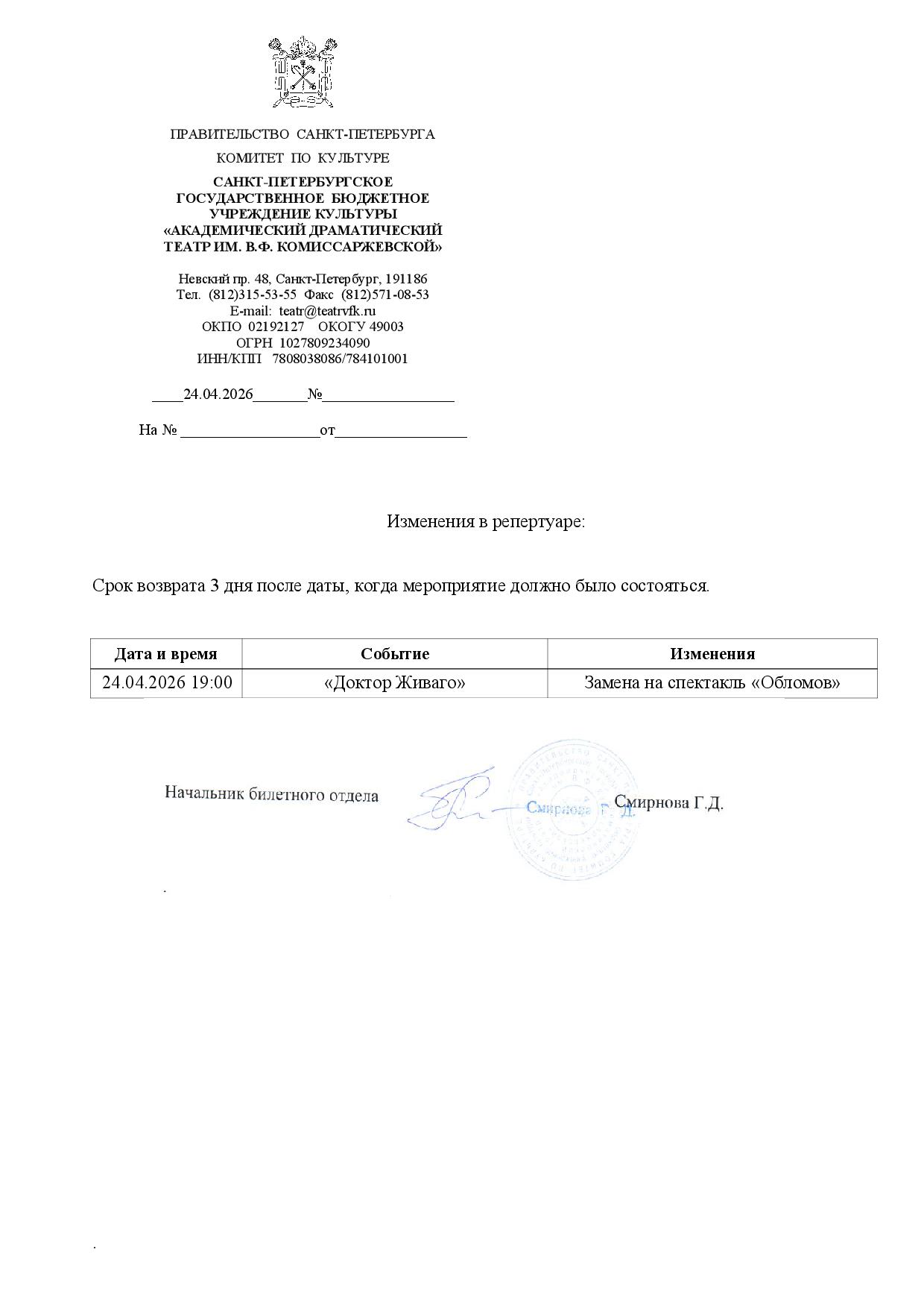 Уважаемый клиент! Спешим сообщить, что по информации, полученной от организатора, спектакль «Доктор Живаго», запланированный на 24 апреля 2026 года в 19:00 в АДТ имени В.Ф. Комиссаржевской, заменён на спектакль «Обломов». Ранее приобретенные билеты действительны на новый спектакль, обменивать их не нужно. Если вам не удобно посетить новый спектакль, вернуть билет можно по кнопке в личном кабинете во вкладке «Заказы» (до 27 апреля 2026 года 19:00). Деньги за электронные билеты вернутся автоматически в полном объёме на карту, с которой была произведена оплата. Если вы купили билет в кассе Ticketland.ru за наличный расчет или оплатили подарочной картой, то обратитесь, пожалуйста, на почту: vozvrat@ticketland.ru. С уважением, команда поддержки Ticketland.