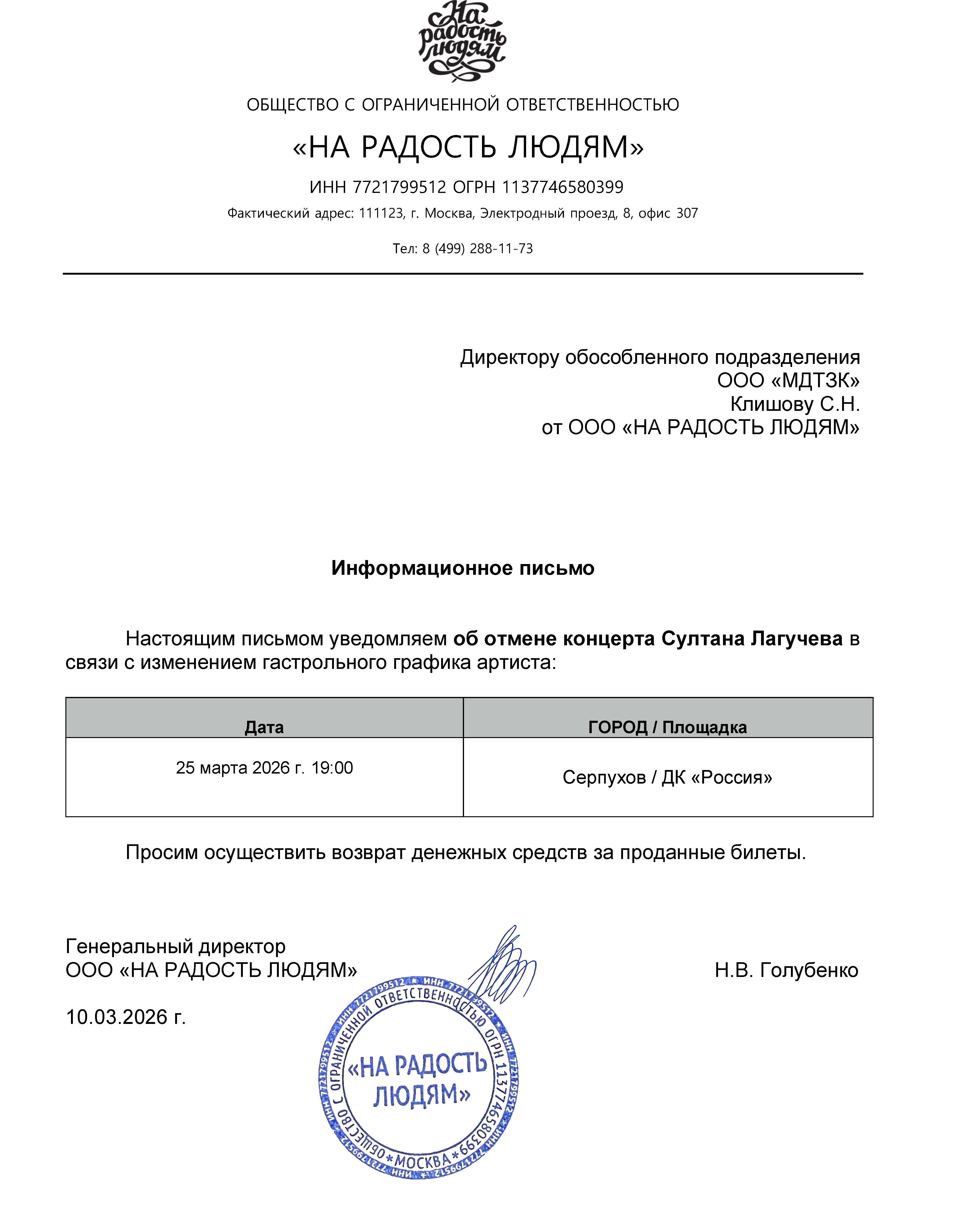 Уважаемый клиент! Спешим сообщить, что по информации, полученной от организатора, концерт Султана Лагучева, запланированный на 25 марта 2026 года в 19:00 в ДК «Россия», отменён. Деньги за электронные билеты вернутся автоматически в полном объёме на карту, с которой была произведена оплата. Если вы купили билет в кассе Ticketland.ru за наличный расчет, то обратитесь, пожалуйста, на почту: vozvrat@ticketland.ru. С уважением, команда поддержки Ticketland.