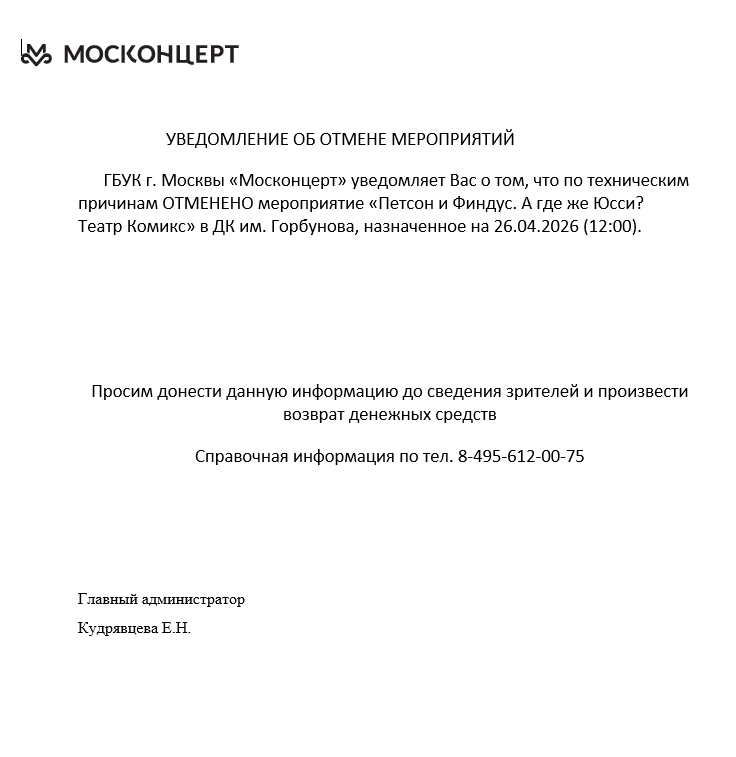 Уважаемый клиент! Спешим сообщить, что по информации, полученной от организатора, спектакль «Петсон и Финдус. А где же Юсси? Театр Комикс», запланированный на 26 апреля 2026 года в 12:00 в ДК им. Горбунова, отменен. Вы можете приобрести билеты на ближайшие даты проведения этого же мероприятия: 25.04 в 12:00 (суббота) и 03.05 в 12:00 (воскресенье) Деньги за электронные билеты вернутся автоматически в полном объёме на карту, с которой была произведена оплата. Если вы купили билет в кассе Ticketland.ru за наличный расчет или оплатили подарочной картой, то обратитесь, пожалуйста, на почту: vozvrat@ticketland.ru. С уважением, команда поддержки Ticketland.